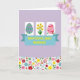 This card features a spring-themed illustration on a soft lavender background, with a soothing blue ribbon-shaped banner stretched across the middle. On the banner, a cheerful yellow Easter message sits centered in a flowing, cursive-style lettering, drawing the eye like a note passed between close friends. Above it, three rounded panels line up neatly: the left shows a teal egg shape decorated with pink wavy bands and scattered dots, the middle holds a cluster of golden-yellow flowers with green stems 🌷, and the right shows a pink egg with white swirls and a small red bow. The arrangement feels affectionate, like two decorated eggs leaning in toward the shared bouquet between them. Below the banner, the scene opens into a dense garden of stylized flowers in red, pink, yellow, and blue, tucked among layered green leaves with small brown details. Hidden in the foliage, a light blue long-eared bunny adds a gentle, companionable touch 🐰. The bottom section sits on a white field filled edge-to-edge with blossoms, tiny bows, and curling stems.