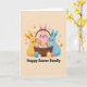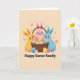 This card shows a rustic woven basket filled with decorated egg-shaped treats, set against a warm peach background with scattered little flowers and leaf shapes 🌷. Three long-eared rabbits gather close around the basket, with a soft yellow one on the left, a gentle pink one peeking from behind, and a calm sky-blue one on the right 🐰. Their tiny dot eyes and small curved smiles give them a sweet, friendly look, like they’re sharing a quiet moment together. The egg designs include dots, tiny blossoms, and simple abstract marks that add variety without crowding the scene. A small yellow egg with its own smiling face peeks out from the basket, adding a cute, companion-like detail beside the rabbits. Below the illustration, the words “Happy Easter Family” sit centered in a dark, easy-to-read color on the light background. The basket’s woven texture is drawn with simple curved lines, and the surrounding floral shapes are spaced lightly around the rabbits and eggs.