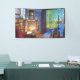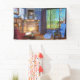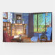 A cozy reading corner on a sunny spring day. Warm sunlight streams in through the lattice windows, leaving shadows on the wall and lighting up the cherry blossom "snowglobe" on the bookshelf. In the window is a colorful suncatcher sparkling in the light. Around the hearth are cushy armchairs, with vases of flowers and books and a steaming teacup, but the windows are open to let in the spring breeze. Outside a spring-green willow and beech hedge and red Japanese maple are surrounded by tulips and cornflowers, while a ginger cat stalks through the long grass.