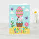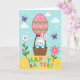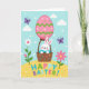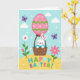 This card shows a white long-eared bunny with a sweet smile and rosy cheeks, cuddled into a rustic basket dotted with small spots, as if it’s been tucked in by a close friend 🐰. The basket hangs beneath a large pastel pink egg-shaped balloon, decorated with green zigzags and scattered white dots that make it look like it’s gently drifting upward. Behind it stretches a clear blue sky with soft puffy clouds and a sprinkle of tiny white and multicolored specks, like confetti caught in the breeze. Two purple butterflies float on either side, angled inward as if they’re keeping the bunny company on the ride 🐇. Below, a sunny yellow field holds a white daisy and a bright pink flower with green stems, leaning slightly toward each other like a friendly pair. The words “HAPPY EASTER!” sit across the yellow ground in big uppercase letters, each letter a different bright color. The balloon’s string lines down to the basket in a neat curve, with the green chevrons and white dots standing out against the soft pink surface 🌷.
