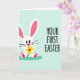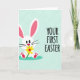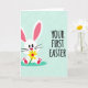This card features a calm mint-green background with a faint geometric grid that adds light texture. On the left stands a stylized white bunny 🐰 on two feet, with long ears showing bright pink inside, big dark eyes, and a small red nose. Fine whiskers extend from its cheeks as it leans slightly forward, as if offering a gift to someone just off to the right. In its paws, it holds a glowing yellow flower with a red center, giving the scene a sweet, friendly, almost romantic gesture. Beneath the bunny is a deep teal oval that grounds the character like a small stage. On the right side, a short Easter message is set in thick, hand-drawn lettering, arranged in two lines and colored in deep teal to match the base. The mint background stays uncluttered, with the bunny and flower as the main focus, and a small 🌷 accent near the text area.