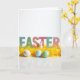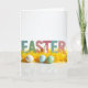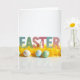 This greeting card features a spring-themed still life with freestanding wooden letters in soft pastel shades like light blue, leafy green, and blush pink, each decorated with a small check pattern. The letters sit snugly in a bed of bright yellow shredded filler that looks like a cozy nest, adding a gentle, affectionate mood to the scene. A small white bunny figurine 🐰 stands among the letters, its smooth shape leaning into the arrangement as if keeping close company. In the foreground, three egg-shaped decorations rest on a glossy white surface, their polished finish catching the light like shared glances across a table. Each egg shows fine pastel patterns—dots, tiny stars, and little floral motifs 🌷—that echo the soft colors above. The main message appears across the center in those painted wooden letters, while the surrounding space stays open and bright to frame the display. Soft lighting creates mild shadows behind the letters and a faint reflection beneath the eggs on the white base.