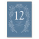 Hand-drawn Spring fleur de lis style elegant framed wedding number with styled spring blooms, leaves, tendrils and little butterflies. In simple classic blue steel gray with white lettering and drawing, personalize with your own names and monogram initials and table numbers. Each number required has to be added to the cart one at a time. Other colors and matching items are available or can be created by request. © Original hand drawing and design by Sarah Trett for www.mylittleedenweddings.com on Zazzle.