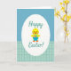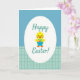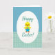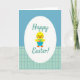 This card shows a plump yellow baby bird centered inside a large white oval, with rosy cheeks, an orange beak, and tiny feet that make it look sweetly bashful, as if sharing a small surprise with a friend. It holds a small blue basket close to its chest, the handle tucked under one wing in a gentle, caring pose. The basket is filled with decorated oval eggs in pink, green, and purple, featuring stripes and zigzag patterns that add a cheerful Easter touch 🐰. Behind the oval frame, the top half of the background is a calm blue-green with fine diagonal stripes, while the bottom half shifts to a lighter aqua with a neat grid pattern. The phrase “Happy Easter!” appears above and below the oval, set in teal lettering that curves softly around the central scene. The spacing leaves plenty of white space so the words feel airy and easy to read, like a note meant for someone close. The bird and basket sit crisply within the white oval, with the teal text hovering above and below against the striped-and-grid background 🌷.