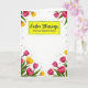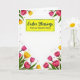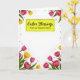 This card features a spring-themed layout with a bright yellow rectangular text box centered on a white background, outlined in green for a sunny, friendly contrast. Inside the box, the greeting is written in smooth, flowing lettering that leans slightly like a gentle handwritten note, set in a darker green that’s easy to read. Around it, tall tulip shapes form a floral frame, with petals in fuchsia, magenta, and warm golden yellow, and stems in leafy green that curl in toward the middle like an affectionate embrace 🌷. The flowers cluster more heavily at the corners and along the edges, creating the feeling of a close circle of friends gathering around the message. Small polka dots are sprinkled across the white space in soft pink and light green, adding a light, friendly rhythm without crowding the design. The overall arrangement feels like a shared spring moment, with the central words held safely inside a bright frame while the tulips lean inward as if exchanging a tender glance 🐰. Soft pink and light green dots scatter evenly behind the tulips, with extra spacing around the central yellow box to keep the text area clear.