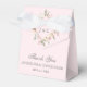 An elegant floral bouquet of pink peonies and ivory roses frame the top of this lovely spring wedding favor box. The sprigs of sage leaves decorate in the midst of the peach array of flowers that surround the beautiful modern typography. Pretty blush color.