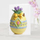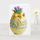 Designed with a tall, egg-shaped sculpture set against a white background, the scene centers on a smooth pale yellow surface that feels gentle and inviting. Near the top sits a cluster of five rounded purple flower buds with green stems gathered closely together, like they’re leaning in as friends. A bright yellow bow ties the stems, adding a sunny touch that reads like a small romantic gesture 🌷. Around the middle, a powder-blue band wraps horizontally, decorated with a wavy line of tiny pink and lilac blossoms and scattered green leaves. In the center of that band, a diamond shape with a lime-green border frames one pink flower, like a little keepsake set carefully on display. A small orange-winged insect with black vein markings rests near the upper area, giving the pastel decorations a lively contrast 🐇. Soft, diffused light highlights the smooth curves, the layered floral details, and the crisp edges of the bow and band.