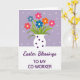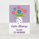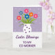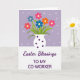 This card features a spring bouquet arranged in a white vase dotted with deep violet circles, giving the scene a sweet, friendly tone 🌷. Above it, a soft lavender background is sprinkled with tiny white dots and small white butterfly shapes drifting across the space. The flowers open in fuchsia, sky blue, orange, and red, each with a yellow center, while green stems and narrow leaves spill outward in a lively, reaching way that feels like a warm hello. The lower portion shifts to a white area that frames the message clearly, like a note left for someone you see every day. The main greeting, “Easter Blessings,” sits centered in rich purple, written in flowing lettering that softens the look. Just beneath it, “TO MY CO-WORKER” appears in uppercase purple text, adding a direct, appreciative touch that reads like friendly affection 🐰. The vase sits centered where the lavender top meets the white bottom, with butterflies floating above the bouquet.