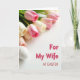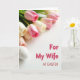 Designed with a soft spring arrangement, the card shows a diagonal sweep of closed flower buds in pale pink, creamy white, and blush peach, 🌷 drawing the eye from the upper left toward open white space. Slender green stems peek between the petals, adding a gentle contrast that keeps the scene fresh and light. In the lower left foreground, a single white egg with tiny brown speckles sits quietly, like a small token placed with care. The lighting is diffused and bright, giving the petals and shell a smooth, slightly dimensional glow without harsh shadows. Against the white background, the message “For My Wife AT EASTER” appears in deep red lettering in the lower right, standing out clearly while leaving the flowers to do most of the talking. The tender pairing of the delicate buds and the resting egg suggests a close bond, like a quiet moment shared between two people. A shallow focus keeps the foreground crisp while the blossoms soften into a gentle blur, 🐇 and the red text remains sharp near the bottom right corner.