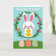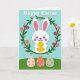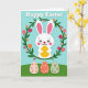 This card features a sweet white bunny with long ears and rosy cheeks, smiling with wide, friendly eyes as it gently holds a shiny golden egg close to its chest 🐰. The bunny sits inside a round wreath of leafy green branches, where the flowers feel like they’re leaning in to frame it like a hug. Pink, orange, and deep red tulips 🌷 mix with smaller blossoms, adding soft romantic warmth through the cozy way the blooms gather around the bunny’s face. Above the wreath, the greeting appears in large white letters, centered near the top against a sky-blue background. Below the main scene, three decorated eggs rest on a light green ground, placed side by side like a small shared collection. Each egg has detailed floral patterns, with one in pale pink, one in warm coral, and one in gentle sage green, creating a calm spring palette. The background stays a smooth, airy blue, and the wreath’s greens and tulip petals show small shaded touches that give the illustration a softly layered look.