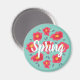 Spring floral magnet created with a vector illustration of a pattern of abstract flowers with bright pink petals over light blue background and the customizable text "Spring".