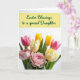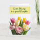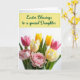 This design shows a spring-themed card with a soft yellow rectangular banner across the top, edged with a thin lime-green border. Centered on the banner is an emerald-green cursive-style greeting, with the letters flowing smoothly and leaving generous margins on all sides. Beneath the text, a full bouquet of tulips and mixed blooms fills most of the lower half, leaning toward the viewer like a close friend offering flowers 🌷. The colors blend creamy whites and buttery yellows with a range of pinks from pale blush to deep fuchsia, creating a gentle, affectionate mood without needing extra decoration. Some flowers have sleek single petals while others are richly ruffled, and the fuller pink blossoms sit forward as if they’re being presented with special care 🐰. A softly lit white background keeps the focus on the petals, while faint shadows add depth around the stems and blossoms. Deep green leaves frame the arrangement and contrast with the lighter blooms, and the bouquet spreads widest along the bottom edge with several pink tulips angled slightly to the right.