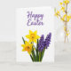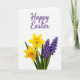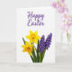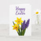 Designed with a bright spring look, this card features a small garden arrangement sitting low on a wide white background, leaving lots of open space above. Two yellow flowers with open petals face slightly toward each other, their orange ruffled centers almost touching like a gentle hello 🌷. Beside them, a tall cluster of tightly packed purple buds rises upward, adding a cozy, close-knit feel as it leans near the yellow blooms 🐰. Fresh green stems and narrow leaves spread out at the bottom, grounding the bouquet with crisp, natural lines. Near the top, a flowing seasonal greeting is placed in purple lettering, centered and easy to spot against the white. Soft, even lighting smooths out shadows and brings out the textures in the petals and the bead-like purple buds. The orange trumpet centers show a delicate wavy edge, and the purple cluster has a grape-like pattern of tiny florets.