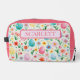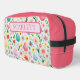 Beautiful pastel colored Easter eggs and Spring flowers are scattered about in a whimsical pattern on the front and back of this toiletry bag. A banner at the top has an easy to use template for you to put your name on the bag. The sides and top of the bag are in a coordinating dark pink. This pretty bag is perfect for makeup or toiletries for an overnight trip.