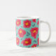 Spring flowers mug created with a vector illustration of a pattern of abstract flowers with bright pink petals over light blue background.