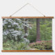 Decorate your living space with this horizontal, hanging wall tapestry with wooden tops that features a photo image of spring blooms in a forest setting that includes pink Rhododendrons and white Viburnum blossoms. A lovely, botanical image!