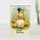 This design shows a vintage-style spring scene with a fluffy yellow bird wearing a dark top hat with a blue band and holding a curved walking stick, standing proudly on a large white egg. Around the egg, five smaller yellow birds gather close, their red beaks and little feet turned toward one another as if sharing a friendly secret 🐰. The setting includes green grass sprinkled with tiny yellow and pink flowers, with a light blue sky stretching softly behind them 🌷. The main figure’s upright pose and the group’s gentle, clustered spacing give the illustration a cozy, affectionate feel without needing any extra fuss. You can almost sense the contrast between the feathery texture of the birds and the smooth, glossy surface of the egg. The words “Easter Greetings” appear near the lower area of the front in dark lettering that stands out against the pale background. Small blossoms dot the ground around the egg, adding little pops of yellow and pink beneath the birds.