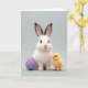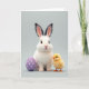 This design shows a white long-eared bunny centered on a soft blue-gray background, its ear tips shaded charcoal with rose-pink inner ears, and its dark shiny eyes turned slightly as if sharing a quiet, friendly moment 🐰. Fine whiskers fan out from a tiny pink nose, and the fur looks plush under gentle, diffused light. To the left sits a lavender egg shape dotted with small white circles, adding a neat graphic touch beside the bunny. On the right stands a small fluffy yellow chick with an orange beak and matching feet, gazing up with the kind of tender attention that suggests close companionship 🐇. The soft lighting creates faint shadows beneath the figures, giving depth while keeping the scene calm and airy. Near the top, a short Easter greeting appears in a simple style, set in light gray lettering that stands out softly against the background. The bunny and chick are arranged close together, with the lavender dotted egg tucked at the bunny’s left side.
