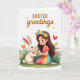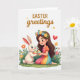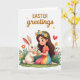 On the front of the card a young girl kneels in a garden, smiling as she offers a decorated egg to a white rabbit 🐰. Her brown hair falls in loose waves, topped with a small wreath of blue and yellow flowers, and her rainbow-striped dress fans out around her knees. The rabbit faces her with rosy cheeks and a gentle, friendly look, holding its own patterned egg as if returning the gesture 🐇. Behind them, leafy green plants fill the scene, scattered with orange, pink, and yellow wildflowers under a bright sky. A small red heart floats above the pair, adding a touch of romance to their close, attentive exchange. Near the top, the words “EASTER greetings” appear in gold lettering, centered and surrounded by tiny star shapes. The stars sparkle around the text while the gold letters sit clearly against the pale sky background.