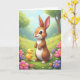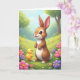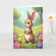 Designed with a springtime scene, the front features a caramel-and-cream bunny standing upright in the foreground, its pink-lined ears and soft whiskers framing big brown eyes that glance down with a tender, friendly look 🐰. Nestled beside it is a small, fluffy yellow chick gazing up as if sharing a sweet little secret, adding a gentle note of closeness between the two. The setting is a sunny meadow with light green grass, dotted with scattered wildflowers in fuchsia, lavender, and soft orange 🌷. In the distance, soft-edged trees with fresh new leaves sit under a calm blue sky, giving the whole scene an open, peaceful backdrop. Fur and feathers are shaded with subtle highlights, so the characters look soft and touchable without heavy outlines. Any greeting text can sit centered near the top in a light pastel tone, with a smaller line near the bottom in a matching color for balance. Tiny blossoms cluster near their feet, and a few petals are sprinkled across the grass in front of them.