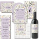 Pretty wedding menu card with beautiful Spring flowers in shades of lavender, blue, pink and yellow. Light purple area for your text.