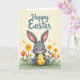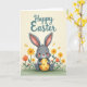 This design shows a long-eared creature centered in the scene, shaded in soft gray with wide, friendly eyes and a faint blush on its cheeks 🐰. It sits calmly in a spring garden where the close, cozy framing makes it feel like the little figure is keeping you company. In its paws, it holds a bright yellow egg decorated with small orange flower shapes, as if it’s offering it with gentle care. Around it, yellow daisy-like blooms and orange tulip-shaped flowers rise from thick green grass, adding a fresh, outdoorsy setting 🌷. The artwork has a light, watercolor-like texture that softens the edges and gives the scene a tender look. Near the top, a festive greeting appears in flowing teal lettering, spaced neatly above the illustration so it feels airy and balanced. The garden background stays simple and softly shaded, keeping attention on the small figure and the egg. Orange tulip-shaped flowers lean inward from both sides, with yellow blossoms scattered between them over layered green blades of grass.