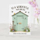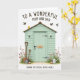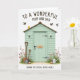 This card features a mint-green garden shed with clapboard siding and a rustic wooden roof, set against a bright white background that makes the scene feel airy and close. Small, dark hardware details and a tiny hanging sign with a four-letter word add a quiet, intimate touch, like a note left for someone special. At the base, a patch of green grass is sprinkled with soft pink, purple, and red wildflowers, their slim stems leaning as if they’re reaching toward each other 🌷. On the left side, a spade and a shovel with warm wooden handles rest against the wall, suggesting shared time spent tending the garden side by side. On the right, a white watering can sits near a single egg in a natural tan shade, hinting at gentle care and new beginnings 🐰. Above the roofline, a few birds glide across the open space, including one in a sunny yellow that draws the eye upward. The front design shows the four-letter sign near the upper area of the shed, with the letters appearing dark against the small plaque. A thin line of grass and scattered blossoms runs along the bottom edge, framing the shed with spring color.