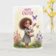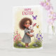 This design shows a young girl with rich, curly brown hair and wide brown eyes, her rosy cheeks close to a white rabbit she’s hugging with a gentle, affectionate hold 🐰. The rabbit rests calmly in her arms, with soft-looking fur and pale pink inner ears that lean toward her as if it trusts her completely. Warm daylight washes over the scene, giving their faces a soft glow that feels like a quiet moment shared between close friends. Along the top, a festive greeting sits centered in rounded, uppercase letters in a bright, sunny color that stands out against the light sky. Below them stretches a spring meadow of fresh green grass with a few smooth gray stones, where fuchsia blossoms cluster on the left and small purple flowers gather on the right 🌷. Near the upper area, two butterflies flutter through the air—one purple and one yellow-orange—adding small sparks of motion around the pair. The girl’s arms curve protectively around the rabbit, and the rabbit’s head tilts inward, creating a tender, close-up focal point. The background stays airy and light, with the colorful flowers, stones, and butterflies framing the girl and rabbit in the center.