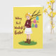This greeting card shows a young girl with rosy cheeks and curly golden hair, topped with a white bow, smiling softly as if she’s sharing a sweet moment with someone just out of view 🌷. She wears a maroon sweater, a white skirt edged with a pink scalloped trim, and brown boots, giving her a cozy, friendly look. In her hands, she holds a simple branch like a little gift, with four egg-shaped decorations hanging from it in aqua, magenta, emerald, and deep violet. Each egg has its own pattern—stripes, dots, and angled lines—adding a light, lively rhythm across the page 🐰. The girl stands on a small patch of green grass that grounds the scene against a bright yellow background that feels like early spring sunlight. On the left side, a flowing handwritten-style greeting appears in maroon ink, set at mid-height and balanced neatly beside the figure. The eggs dangle from thin strings, spaced evenly along the branch, with their patterned surfaces clearly outlined against the yellow field.
