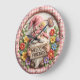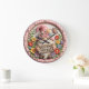 This charming round wall clock features a whimsical 3D-style digital illustration of a cheerful garden gnome. The gnome, sporting a long white beard and a tall pink hat adorned with a checkered bow and colorful blossoms, holds a rustic wooden sign that reads "WELCOME FRIENDS." The scene is nestled within a lush frame of sculpted flowers in vibrant shades of pink, yellow, blue, and purple, accompanied by a delicate butterfly. The background consists of light-colored wood planks, while the outer rim of the clock features a stylish pink and white gingham check pattern with elegant numeric markers. This functional home decor piece is a perfect addition to entryways, kitchens, or sunrooms, serving as a warm greeting for guests. It makes a delightful housewarming gift or seasonal accent for anyone who loves folklore and garden-themed art.