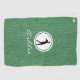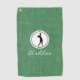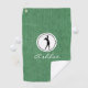 Black silhouette of lady golfer in a round white frame with name, on a spring green denim print golf towel. Personalize the name to create a unique golf gift and keepsake. Change text to make it yours using the simple Template provided. Dimensions: 16" x 24", 80% woven polyester/ 20% polyamide blend microfiber, grommet and brass-plated hook included. Machine washable.