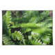 A close-up image of spring green ferns illuminated by dappled light through the forest’s canopy.