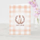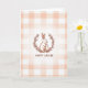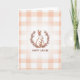 Designed with soft spring charm, this vertical card shows a long-eared rabbit standing close beside a small, fluffy chick, their gentle lean toward each other suggesting quiet friendship 🐰. The pair sits inside a simple wreath made of thin branches and leafy sprigs, giving the scene a cozy, outdoorsy setting. A tiny five-petal flower rests near the bottom of the wreath, adding a small seasonal touch 🌷. Beneath the illustration, the words “HAPPY EASTER” appear centered in a clear, sans-serif style. The lettering is set in a dark tone that stands out clearly against the lighter background. Behind everything is a pastel gingham pattern in light peach and white, like a soft checkered cloth. The rabbit and chick are drawn with neat lines that contrast with the gentle, muted backdrop. The wreath’s branches curve around them in an oval frame, with the small flower tucked at the base.