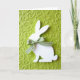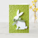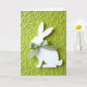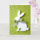 This design shows a crisp white silhouette of a springtime bunny set against a bright lime-green background, creating a fresh, eye-catching contrast 🐰. A neatly tied fabric ribbon sits at the bunny’s neck, patterned in green-and-white checks that add a cozy, country touch. The smooth edges of the bunny shape feel calm and tender, like a quiet gesture shared between close friends. Across the green backdrop, raised swirling lines form leafy curls and small floral shapes, giving the surface a textured, touchable look. Soft lighting skims over those raised details, leaving gentle shadows that make the pattern feel layered and inviting. Near the top, a short Easter greeting appears in simple white lettering, centered so it feels balanced and easy to read 🌷. The lower area is left open and uncluttered, letting the bunny and ribbon stay in focus while the embossed vines continue faintly behind them. The green field is filled with subtle, raised tendrils and leaf motifs that curl around the bunny’s outline.