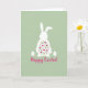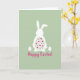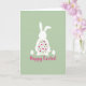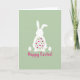 The front design shows a pure white silhouette of a sitting hare with long ears, set against a muted sage-green background that feels like a quiet spring morning 🐇. Inside the gentle curve of its body sits a decorated oval filled with fuchsia and deep magenta flowers, soft lavender petals, and small emerald leaves, dotted with tiny dark specks on a creamy base 🌷. The floral cluster reads like a tucked-away garden, adding a tender, companionable warmth to the hare’s calm pose. Two smaller plain white ovals sit nearby, balancing the layout and giving the central figure a sense of company. The composition stays simple and centered, letting the hare and its inner floral detail draw the eye first. Along the lower area, a seasonal greeting appears in flowing cursive-style lettering, colored in a bright pink tone that echoes the blossoms above. The sage background remains smooth and understated, making the white hare and the pink lettering stand out clearly. The hare’s crisp outline frames the ornate oval like a gentle embrace, with the long ears pointing upward against the soft green field.