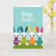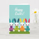 This card shows four small white bunny-like creatures lined up along the lower half, each with round faces, dotted eyes, and tiny smiles that feel like a shared secret between friends 🐰. Their tall ears add a cheerful color rhythm in teal, deep navy, sunny yellow, and magenta, making the row look coordinated and close-knit. Each one hugs an oversized egg, held snugly as if they’re exchanging a gentle spring surprise. The eggs are decorated with graphic patterns: purple with pink zigzags, green with yellow chevrons, orange with yellow streaks, and teal with purple wavy stripes. A bright green band of grass runs beneath their feet, sprinkled with a few small white six-petaled flowers 🌷. Near the top, a large handwritten-style greeting appears in crisp white lettering, centered against a wide sky-blue background. The overall scene stays simple and airy, with the characters clustered together in a way that suggests warmth and affection. The sky-blue backdrop leaves plenty of open space above the white greeting and the colorful ears and patterned eggs below.