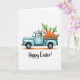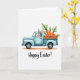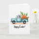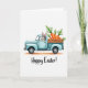 This design shows a retro-style pickup truck in soft pastel blue, drawn in a gentle watercolor look against a white background. A gray long-eared bunny 🐰 leans out of the driver’s window with rosy cheeks and an open smile, as if sharing a quick, friendly hello with someone just off the page. The truck sits in side view with rounded vintage curves, and a light sandy wash beneath the tires adds a grounded, sun-warmed touch. In the wooden-slat bed, a generous pile of orange root vegetables is stacked high, their leafy green tops fanning out like a spring bouquet 🌷. The scene feels like a sweet delivery moment, with the bunny’s bright expression suggesting a caring stop made just for a friend. Beneath the illustration, a flowing message line is centered and written in a medium gray tone, sized to sit neatly under the truck without crowding it. The orange vegetables and green leaves stand out crisply against the white space, while the truck’s pale blue body keeps the overall look soft and airy.