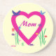 A heart, flowers, grass and two doves set on a pale yellow background grace this whimsical, charming coaster. With the simple word MOM it is perfect for Mother's Day, or any day. The text can be customized to suit your needs.