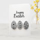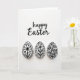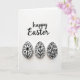 This card features a bright white background with a flowing black greeting placed across the upper area, like a gentle note shared between close friends. Beneath the text, three white egg shapes sit in a neat horizontal row, each edged and filled with fine black botanical linework. The left egg shows a centered flower with radiating petals and small dotted accents, giving it a tidy, folk-style look. The middle egg has a longer floral form with curling swirls and tiny speckles that feel like a soft, flirty flourish, as if two people are exchanging knowing glances 🌷. The right egg is packed with layered leaves and small blossoms, creating a cozy garden effect that suggests quiet togetherness. The lettering stays at the top in black, while the eggs anchor the lower half with consistent black outlines and details 🐇. All three eggs are white with crisp black floral patterns, aligned evenly under the top line of text.