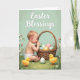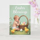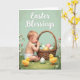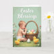 This card shows a sweet spring scene with a fair, wispy-haired baby sitting on rich green grass, leaning toward a woven basket as if sharing a curious little moment with it 🌷. The basket is filled with decorated egg shapes painted in soft blues, gentle pinks, and sunny yellows, each marked with tiny floral and geometric patterns. The baby’s round hands reach forward, and the pose reads like quiet affection and trust, as though the scene is inviting someone close to lean in and look together 🐰. Two fluffy yellow chicks stand nearby with bright orange beaks and feet, angled toward the baby like friendly companions. Soft morning light washes over everything, giving the grass and figures a calm, tender glow. Small white wildflowers and slim pink buds dot the ground around the group, adding delicate framing at the edges. Across the upper mint-green background, a flowing white message sits centered and easy to spot. The basket’s earthy weave and the chicks’ feathery texture stand out against the smooth mint backdrop.