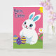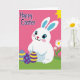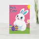 This design shows a chubby white bunny with long ears tipped in bright blue, wide blue eyes, and a soft pink blush on its cheeks, with a tiny red heart-shaped nose that gives it a tender, friendly look 🐰. The bunny sits low in the foreground on a strip of rich green grass, as if pausing to share a quiet moment with whoever’s reading. To its left are three decorated eggs, arranged close together like companions, with yellow stripes on deep blue, light blue dots on purple, and another striped egg that echoes the first. The background above is a solid, intense fuchsia that makes the characters stand out clearly. Near the top right, a simple yellow sunburst peeks in, adding a bright daytime touch. A short greeting line can be placed across the upper fuchsia area in white lettering, with a smaller note near the bottom edge in pale yellow, keeping the focus on the bunny and eggs 🐇. On the right side of the grass, several white daisy-like flowers with yellow centers rise beside the bunny.