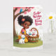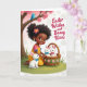 The front design shows a young girl with dark curls and a pink flower clip, smiling softly as she kneels on green grass and leans close to three white rabbits 🐰. She wears a yellow dress with pink sleeves and small blue bows, and her gentle posture suggests a sweet, friendly bond with the animals. Two rabbits sit tucked together inside a woven basket trimmed with a green ribbon and tiny pink blossoms, each wearing a small pastel bow tie in blue and pink. A third rabbit sits beside her with a light blue bow, looking up as if returning her tender gaze 🐇. Above them, a sturdy tree trunk rises with clusters of pale pink blossoms, and a small blue bird perches calmly on a branch. In the upper right, a short Easter greeting appears in crimson cursive-style lettering, floating over a background that fades from soft rosy pink into white. The backdrop also includes faint white dot-like circles that drift across the gradient like airy bubbles near the tree and text.