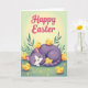Designed with a soft spring morning look, the scene centers on a plump lavender cat with white face markings and a lightly striped tail, curled up asleep with a tiny, content smile. Six fluffy yellow chicks nestle around and on top of the cat, their little orange beaks and feet adding bright touches as they lean in close like affectionate friends. The cat’s relaxed posture and the chicks’ snug perches create a gentle, caring closeness that feels quietly romantic in its tenderness. Leafy green plants frame the picture, while the ground shows short blades of grass and small yellow flowers scattered like confetti 🌷. Near the top, the words “Happy Easter” sit above the characters in magenta lettering, standing out clearly against the light background. A soft yellow glow behind the text fades into a mint-green gradient that washes across the whole design, giving everything a calm, dreamy finish 🐰. The overall palette stays in pastel greens, yellows, and purples, with rounded shapes that keep the scene friendly and sweet. The chicks’ bright yellow feathers contrast against the lavender cat as they cluster in a loose circle beneath the “Happy Easter” text.