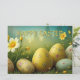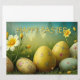 A picturesque spring motif with artfully decorated Easter eggs set amidst lush grass and blooming flowers. The yellow and green tones radiate warmth and freshness, while the softly shaded background with fir trees lends a harmonious depth. A perfect picture that combines the festive Easter mood and the awakening nature.