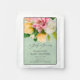 Beautiful floral baby shower design featuring a gorgeous bouquet of peach, pink, yellow & white flowers set on a light green background.