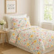 This exquisite duvet cover showcases pastel pink, yellow, and blue hues against a light gray backdrop. The inclusion of green leaves serves as an accent to this charming floral design. Ideal for spring and extending through the fall season, this duvet cover will transform your bed. The delicate floral pattern creates a cozy ambiance within your bedroom, while the reverse side features a soft pink, mirroring the floral prints color.