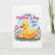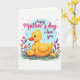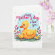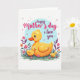 Designed with a sunny family scene, the illustration centers on a large bright yellow duck with a rosy cheek and a gentle, caring look toward two smaller ducklings close by ❤️. The ducklings match her warm color and round shapes, leaning in as if following her lead, which adds a cozy, affectionate feel to the moment. They stand in a springy foreground of green grass with scattered flowers in pink and orange, plus touches of purple leaves for contrast. A soft blue circle behind them suggests sky or water and helps the yellow figures stand out against the white background. Small fuchsia dots are sprinkled around the edges like confetti, keeping the layout light and cheerful 🌼. Across the top, a short message sits in flowing lettering, shaded in magenta and purple, with the words centered above the ducks. The flowers cluster near the lower edge, with pink and orange blooms on either side of the trio and purple foliage tucked between the grass blades.