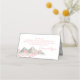 Pink spring blossoms and mountain range watercolor place card to seat your guests. Pink and grey mountain wedding folded seating card with line for hand writing names and table number and personalized names and message on reverse side.