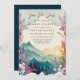 The overall effect is one of whimsical romance, with the watercolor floral design adding a touch of enchantment to the mountain landscape. This save the date card is perfect for a spring wedding, or any wedding that celebrates the beauty of nature and the joys of love.