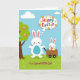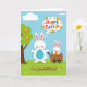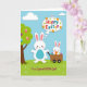 This greeting card shows two stylized white, long-eared creatures with soft pink inside their ears, set in a sunny spring field 🌷. The taller one stands with a rounded body and a calm blue oval on its chest, arms open as if inviting a hug, while the smaller one rides close by in a rustic wooden cart with an eager, affectionate glance 🐰. The cart is piled with brightly decorated egg shapes in mixed colors, and more of those eggs hang like ornaments from a slim tree on the left with bright green leaves. A light blue sky stretches behind them with a single fluffy white cloud, keeping the scene airy and gentle. Near the top, a cloud-shaped thought bubble holds a seasonal greeting in multicolored letters, centered and easy to read. Small blossoms and star shapes decorate around the bubble, and a tiny long-eared face peeks out from one side as if spying on the pair. Along the lower foreground, a warm dedication line appears in flowing lettering in a soft, rosy tone.